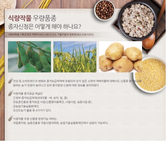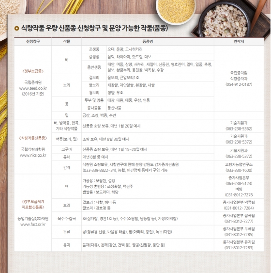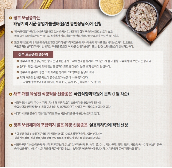 ► 식량작물 종자공급 체계와 정부 보급종자, 새로 개발 육성된 식량작물 신품종, 정부 보급체계에 포함되지않은 유망 신품종 등의 종자 문의 및 신청 방법을 설명
